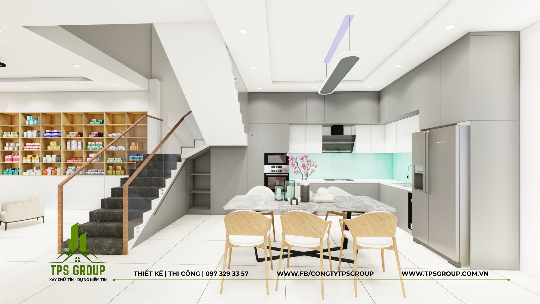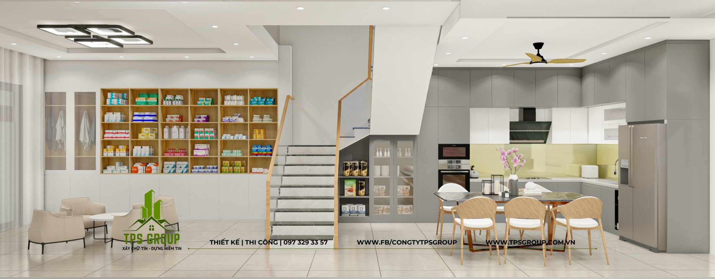 Tầng trệt được bố trí phòng khách kết hợp không gian kinh doanh nhỏ, giúp gia chủ thuận tiện vừa sinh hoạt vừa phát triển công việc.