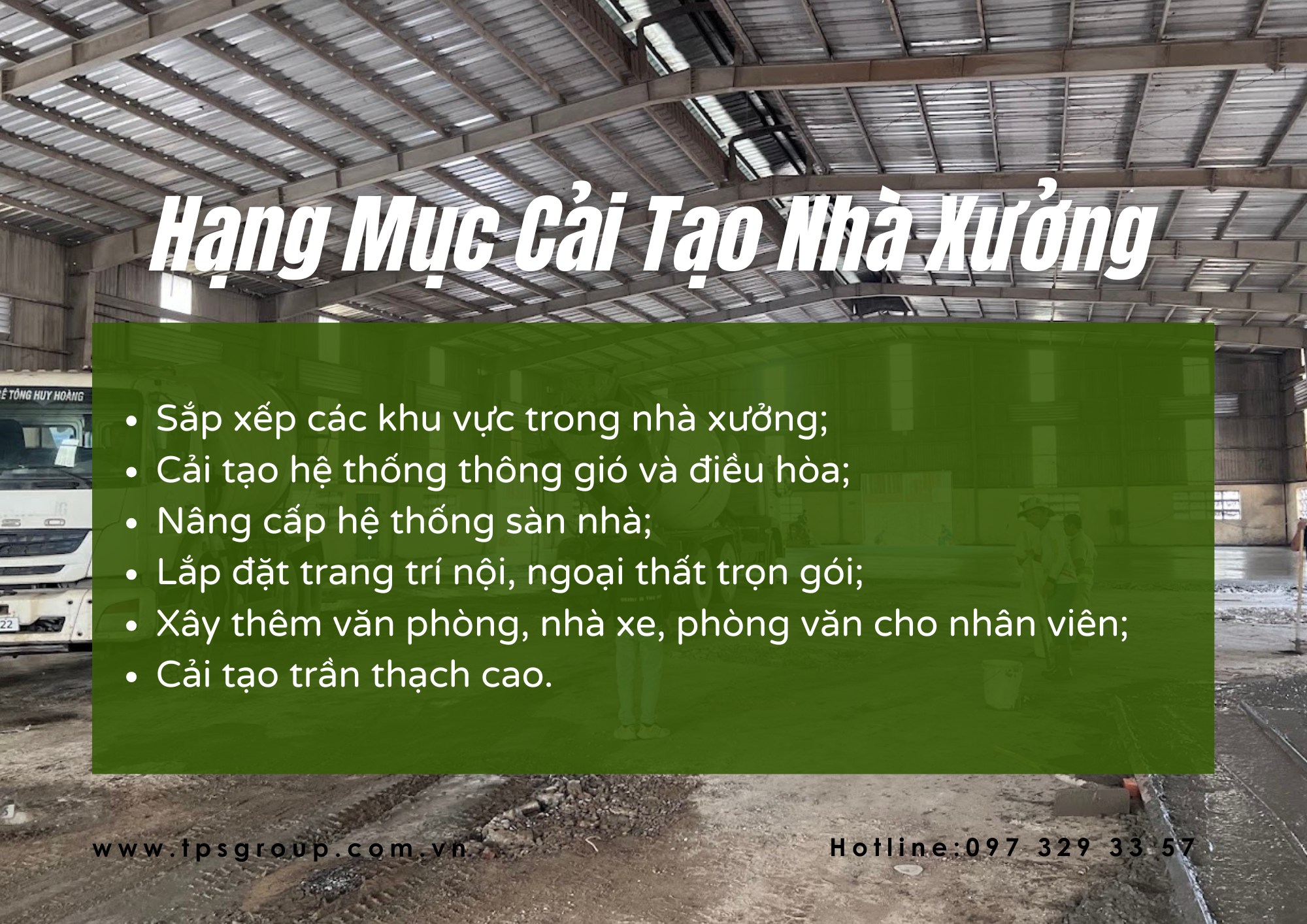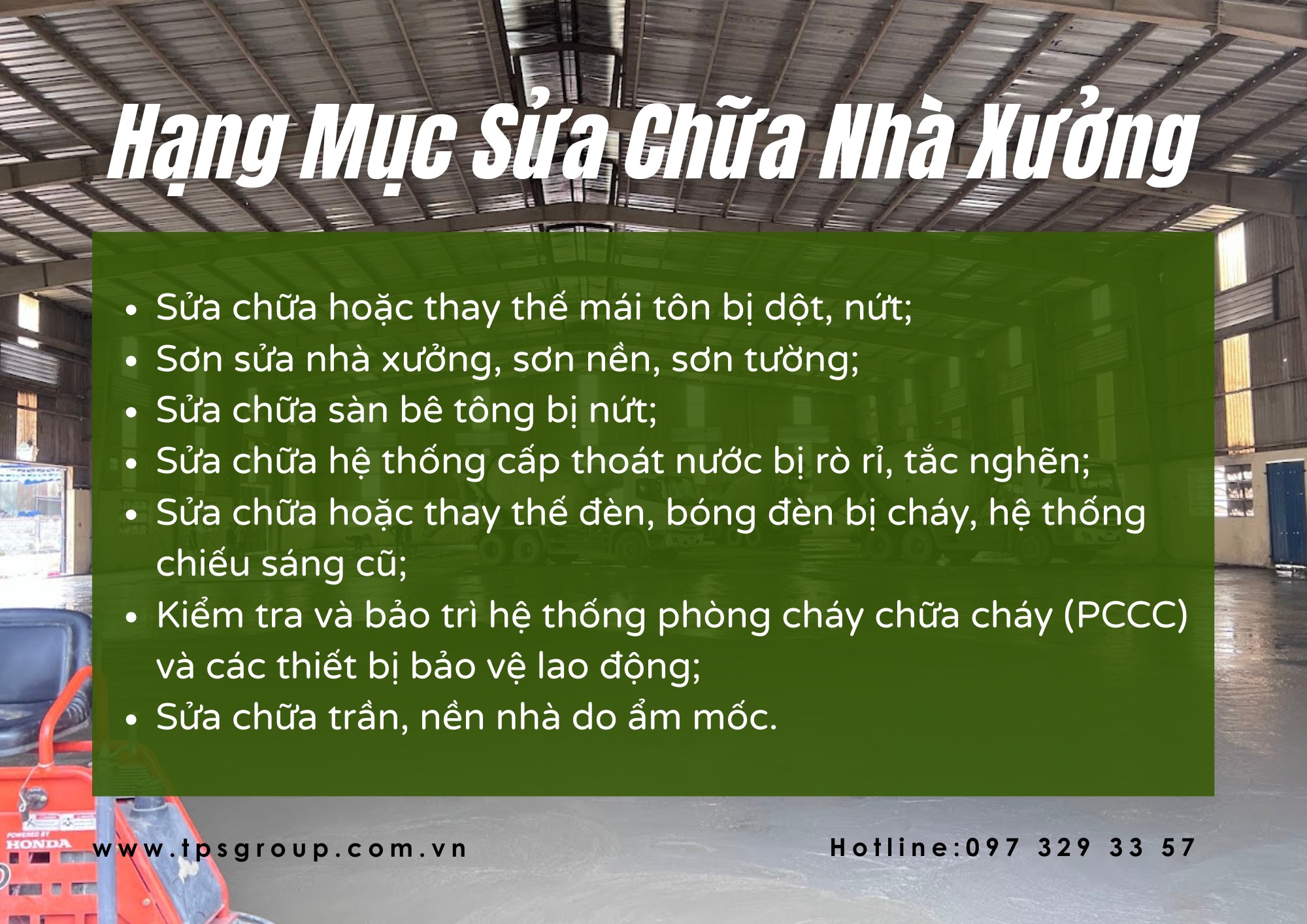 Bạn đang tìm giải pháp sửa chữa và nâng cấp nhà xưởng an toàn và hiệu quả? Hãy để TPS Group - XD 186 đồng hành cùng bạn! Liên hệ ngay qua hotline: 097 329 33 57 để được tư vấn miễn phí và nhận báo giá nhanh chóng!