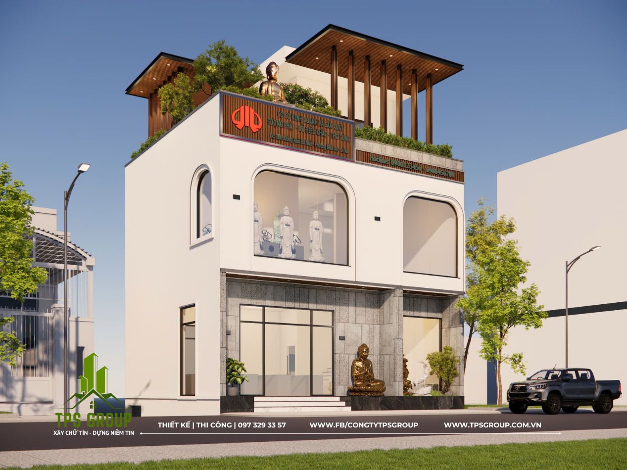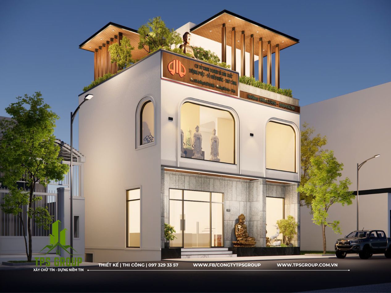 TPS Group lựa chọn phong cách kiến trúc tối giản, nhấn mạnh các mảng khối rõ ràng và đường cong mềm mại tại hệ cửa. Toàn bộ mặt tiền sử dụng vật liệu hiện đại kết hợp mảng xanh, giúp công trình nổi bật nhưng không phô trương.