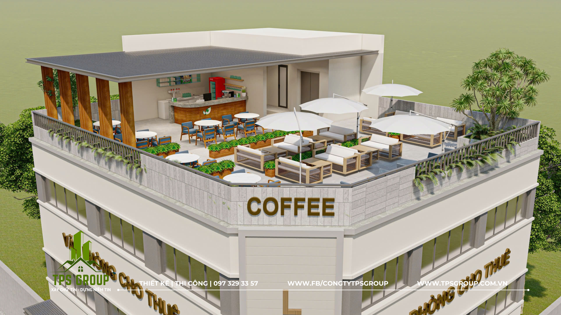 Không gian cà phê sân thượng là điểm nhấn nổi bật của dự án, nơi nhân viên và khách hàng có thể thư giãn, gặp gỡ, trao đổi công việc trong không gian xanh mát và thoáng đãng.